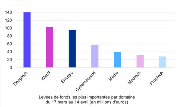 Sur le montant total levé, 140 millions d’euros ont été générés par des deeptech, soit 21.38% du montant total levé, suivi par les entreprises du web3 avec 103,2 millions d’euros, ce qui représente 15.76%, les startups dans le domaine de l’énergie arrivent en troisième position avec une levée de 95,5 millions d’euros, qui représente 14,58% du total.